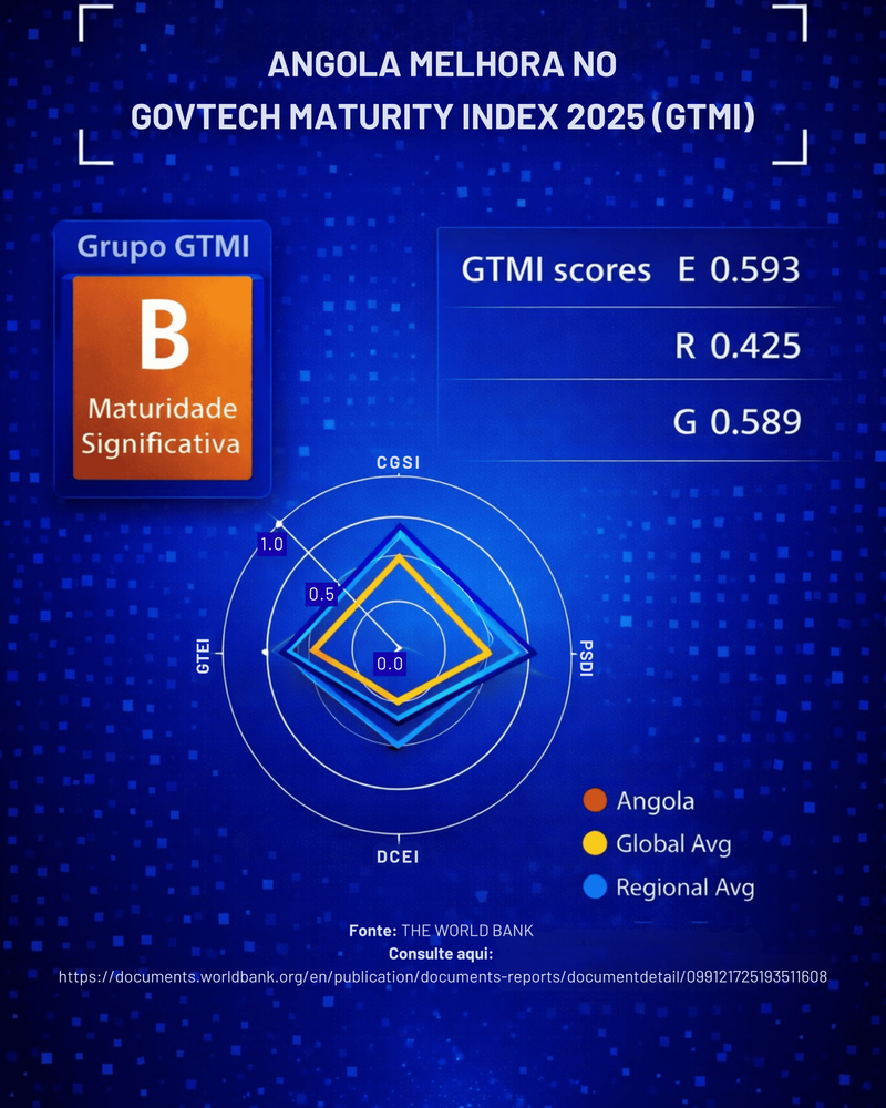 Neste exercício, Angola passou a integrar o Grupo B, correspondente a um nível de maturidade GovTech significativa. Importa sublinhar que o GTMI não é um ranking, mas um benchmark, que organiza os países em grupos (A a D) com base na sua maturidade institucional e tecnológica.